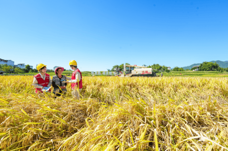 近日,重庆垫江县沙坪镇毕桥村水稻制种基地一片金黄。国家电网重庆电力(垫江营销)红岩员服务队的4名队员正帮助种粮户钟世良抢收“Q优一号”稻谷,并将稻谷转运至院坝晾晒。